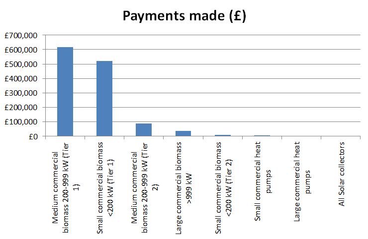 In terms of overall numbers the results are modest. In England the number of accredited installations is 406. Of these 358 (88%) are for biomass boilers, 25 (6%) for solar thermal and 19 (5%) for ground source heat pumps.