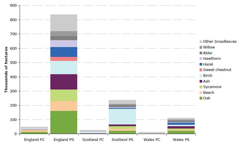 - The estimated stocked area of broadleaves within Great Britain is 1.3 million hectares