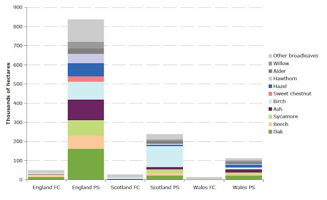- It is more abundant in England (12.1 000ha) than Scotland or Wales but in England Sycamore and Beech are also abundant.