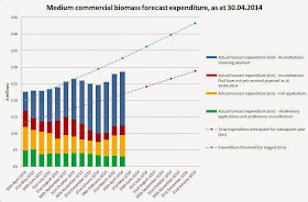 Activity in the large biomass tariff category is far lower than the other categories. However, there are clearly a number of schemes at pre-application stage (green column) and these may start to have greater impact on budgets over the next 24 months.
